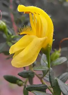 The plant produces branchlike inflorescences which bear snapdragon-like flowers. Each hairy, glandular flower is about 2 centimeters wide, with three lower lobes which lie flat or curve down and two upper lobes which join to form a curved lip. Inside the flower are shiny filamentous stamens holding anthers and a flat, densely hairy sterile stamen called a staminode. The flowers are light yellow and dry to nearly black.