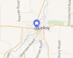 The house is located on a three-quarter–acre (3,000 m2) lot, more than twice as deep as it is wide, on the south side of Main Street, just east of its intersection with Lake and Clay streets (New York State Route 19) in the center of the village. Most of the neighboring properties are large non-residential structures: a supermarket to the west, the village hall to the east with Le Roy's commercial district on the other side of Route 19, and another large commercial structure to the north across the street. A block of residences begins to the northwest. The terrain begins to slope slightly downward to the east and Oatka Creek at that point.[1]