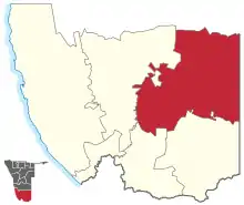 Keetmanshoop Rural is an electoral constituency in the ǁKaras Region of Namibia. It contains the Krönlein suburb of Keetmanshoop and the villages of Koës and Aroab, the settlements of Seeheim and Klein Karas, as well as several farming communities in the area. The constituency office is situated in Aroab.[1] It had a populations of 7,219 in 2011, up from 6,399 in 2001.[2] As of 2020 the constituency had 6,398 registered voters.[3]