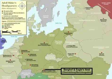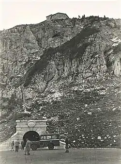 The Kehlsteinhaus (known as the Eagle's Nest in English-speaking countries) is a Nazi-constructed building erected atop the summit of the Kehlstein, a rocky outcrop that rises above Obersalzberg near the town of Berchtesgaden, in southeastern Germany. It was used exclusively by members of the Nazi Party for government and social meetings. It was visited on 14 documented instances by Adolf Hitler.[1][2] Today, it is open seasonally as a restaurant, beer garden, and tourist site.