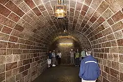 From a large car park, a 124 m (407 ft) entry tunnel leads to an ornate elevator that ascends the final 124 m (407 ft) to the building.[5] The tunnel is lined with marble and was originally heated, with warm air from an adjoining service tunnel. However it was normal for visiting high-officials to be driven through the tunnel to the elevator. Their driver would then have to reverse the car for the entire length of the tunnel as there was no space to turn.[4]