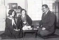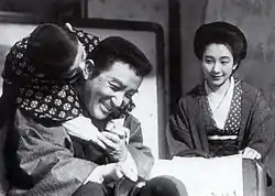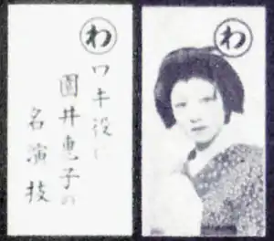 The theatrical troupe Kuraku-za (苦楽座, "Pleasure and Pain Company") was formed afterwards,[20] on July 8, 1942 (2 months prior to Sonoi leaving Takarazuka) by Sadao Maruyama and others, namely Tokuemon Takayama (Kenji Susukida), Keita Fujiwara (Kamatari Fujiwara), and Musei Tokugawa.[46] Of the initial run of three plays, Sonoi was cast in Genkanburo ("entryway bath").[34][46] She continued performing for the troupe, appearing in Yume no su ("Dream's nest", 2nd run, June 1943 at the Hōgakuza), Eien no otto ("Eternal husband". 3rd run, January 1944 at the Kokumin Shingekijo[lower-alpha 10]).[25][46]