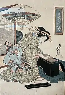 Keisai Eisen (渓斎 英泉, 1790–1848) was a Japanese ukiyo-e artist who specialised in bijin-ga (pictures of beautiful women). His best works, including his ōkubi-e ("large head pictures"), are considered to be masterpieces of the "decadent" Bunsei Era (1818–1830). He was also known as Ikeda Eisen, and wrote under the name of Ippitsuan.