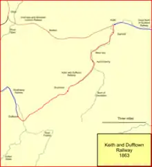 The motivation for a railway line linking Dufftown was still in place, and in 1856 plans were deposited for the Keith and Dufftown Railway. It was to be a nine-mile line, with a possible extension to mineral workings in Glenrinnes; capital was proposed to be £50,000; the Bill allowed for the line to be worked by either the GNoSR or the Inverness and Aberdeen Junction Railway. The GNoSR, itself desperately short of money, agreed to subscribe £1,000 to the new company. On that basis the Keith and Dufftown Railway was authorised by Act of 27 July 1857. Most of the route closely followed the River Isla but there were some stiff gradients.[4][5][6][7]