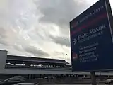 The signboard leading to the station, with the island platforms viewed from the exterior.