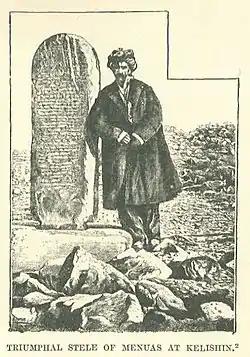 The Kelashin Stele (also Kelishin or Keli-Shin; from Kurdish Language: Blue Stone) found in Kelashin, Iraq, bears an important Urartian-Assyrian bilingual text dating to c. 800 BC, first described by Friedrich Eduard Schulz in 1827. Part of Schulz's notes were lost when he was killed by Kurdish "bandits", and later expeditions were either prevented by weather conditions or Kurdish brigands, so that a copy (latex squeeze) of the inscription could only be made in 1951 by G. Cameron, and again in 1976 by an Italian party under heavy military protection.