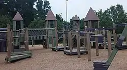 The 25 acre park is dominated by a large wooden playground structure. It is split into two separate sections, one for younger children (2-5) and the other for older children (5-12).
