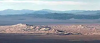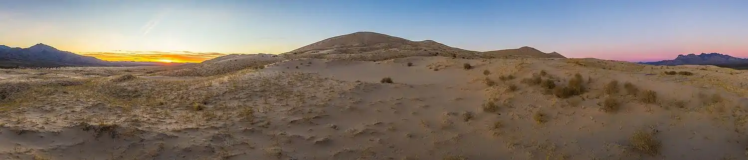Kelso Dunes, also known as the Kelso Dune Field, is the largest field of aeolian sand deposits in the Mojave Desert. The region is protected by the Mojave National Preserve and is located near the town of Baker, San Bernardino County, California, and the Preserve Visitor Center.[1] The dune field covers 45 square miles (120 km2) and includes migrating dunes, vegetation-stabilized dunes, sand sheets, and sand ramps. The tallest dunes rise up to 650 feet (200 m) above the surrounding terrain.