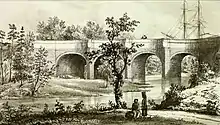 The piers are buttressed in such a way as to resemble cutwaters, but only one pier sits in the river.[2] The sides of the aqueduct are arched in order to transfer the outward pressure of the water onto the buttresses, an effect which can clearly be seen from above.[7][8] This design feature is also present on the Luggie Aqueduct at Kirkintilloch, which opened in 1773.[9]