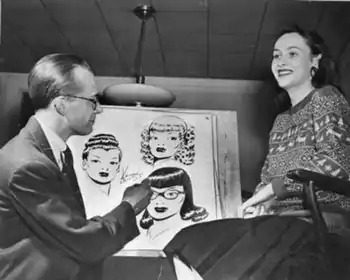 Ernst rendered the strip in a realistic style "inspired by that of his mentors Milton Caniff and Noel Sickles."[11] His Mary Worth became a prototype for the "gentle and sophisticated" soap opera strip.[8] Eminent comic strip historian Coulton Waugh made note of Ernst's "smooth, smart, dressy, modern style." Waugh also admired Ernst's device of drawing a group of characters in a panel without any background and—through clever use of shadow—making the figures appear to leap out of the panel.[12]