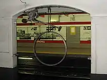 The Kendall Band is an interactive sound sculpture located in Cambridge, Massachusetts, in Kendall Station. The work consists of three interactive instruments that are played using handles located on both the inbound and outbound subway platform walls.[1] Each instrument was designed so that it could be played from either platform of the subway station. Aluminum, steel, and teak were all used in the construction of the musical instruments, with the teak being used for the heads of the hammers.[5] The ensemble was created by Paul Matisse, who is the grandson of Henri Matisse and stepson of Marcel Duchamp.[1] Matisse won the commission in 1981 to create a sculpture for Kendall Station,[6] as part of an effort to beautify the Red Line and its stations. This effort was known as the "Arts on the Line" program,[4] and was "the first program in the nation to put works of art in public transportation systems."[7] The work was not installed until 1987 due to station reconstruction.[6]
