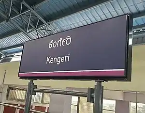 Kengeri is a western terminal metro station on the Purple Line of the Namma Metro serving the suburbs of Kengeri city bordered by Nagarbhavi to the north and Rajarajeshwari Nagar to the east. Kengeri is a suburb of Bangalore in Karnataka, India. It was inaugurated on 29 August 2021 and was commenced to the public on 30 August 2021.[1][2]