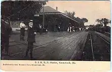 From the 1840s until 1873, the Boston and Maine Railroad (B&M) used the Portsmouth, Saco and Portland Railroad to reach Portland, Maine. That year, after the joint lease of the PS&P by the B&M and the Eastern Railroad ended, the B&M built an extension of its mainline from South Berwick, Maine to Portland.[1]: 95 The foundation for a station at Kennebunk on the new line was begun in 1872 and the station opened the next year.[3] The station was built as a single-story clapboard structure, typical of B&M stations on the line.[1]: 164