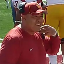 Polamalu coached running backs and special teams for the USC Trojans from 2000 to 2003.[3] He coached Justin Fargas, Hershel Dennis and Tom Malone. Prior to that he coached at the high school level and for University of California, Los Angeles (UCLA), San Diego State University and the University of Colorado at Boulder. He coached the Cleveland Browns in 2004 and the Jacksonville Jaguars from 2005 to 2009.[3] On July 24, 2010, Polamalu accepted a position with USC to become the offensive coordinator. The hiring led Tennessee Titans coach Jeff Fisher to publicly criticize USC head coach, Lane Kiffin, for not following generally accepted National Football League (NFL) protocol: that the head coach or athletic department of the interested team should call the other head coach and let him know that he will be contacting an assistant on their staff. Fisher was upset that Kiffin called and left a voicemail after Polamalu had already accepted the job. Kiffin then explained that he called Polamalu on Friday, July 23, to gauge his interest; after getting Polamalu's positive answer on Saturday, Kiffin called Fisher and left a message.[4] On July 26, 2010, the Titans filed a lawsuit against Kiffin and USC for "maliciously luring" Polamalu away, asking for damages.[5] On December 4, 2013, it was announced that Polamalu was hired to be the running backs coach at UCLA.[6]