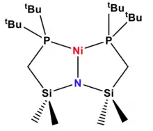 In recent years, Caulton worked on studying the reactions of small typically inert molecules with metal complexes. Notably, he synthesized a nickel complex, (PNP)Ni, and using it to cleave the C=O bond in CO2. The nickel in this complex draws significance from its d9 configuration, which is similar to Cu(II), but is a stronger reducing agent. The T-shaped geometry and low coordination number of this complex suggested it would be a good reducing agent. However, Caulton's research has shown that, in spite of the one-electron reducing power of Ni, the Nickel reacts more as an amide nucleophile than as a reducing agent.[7] Furthermore, he investigated the reaction of the same complex (PNP)Ni with a hydride group attached. This study was aimed at analyzing which ligand, the amide nitrogen or the hydride, would undergo reaction with CO2. After using NMR spectroscopy to analyze the data, it was determined that the hydride ligand is inactive with CO2. However, this ligand weakens the Ni-N bond, thus increasing the nucleophilicity of the amide group.[8]