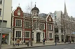 By the 1870s the improvement commissioners were already finding the building too small and they relocated to a more substantial building in 1880.[8] The old vestry hall was then converted for use as the Kensington Central Library and was officially re-opened in that capacity by Princess Louise, Duchess of Argyll in November 1889.[9] The building remained in use as a library for much of the 20th century until the Kensington Central Library relocated to a new site on Hornton Street in 1960.[2] The old vestry hall was listed as Grade II by English Heritage on 15 April 1969[1] and, by 1998, it was "the only substantial remnant" of what the street looked like during the Victorian era.[7] It subsequently became the home of Bank Melli Iran.[10][11]
