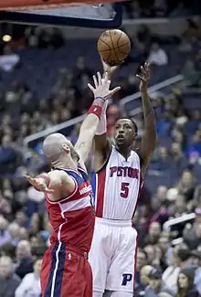 On December 16, 2015, Caldwell-Pope scored a then career-high 31 points in a 119–116 win over the Boston Celtics.[10] He helped the Pistons finish the 2015–16 regular season with a 44–38 record, which was good for the eighth seed in the Eastern Conference. The Pistons thus qualified for the playoffs for the first time since 2009. In the first round of the playoffs, the Pistons faced the first-seeded Cleveland Cavaliers, and in a Game 1 loss on April 17, Caldwell-Pope scored a team-high 21 points.[11] The Pistons went on to lose the series 4–0.