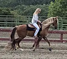 The breed exhibits a natural ambling gait, called the single-foot, which replaces the trot seen in a majority of horse breeds.[2] Both gaits are an intermediate speed between a walk and a canter or gallop; ambling gaits are four-beat gaits, whereas the trot is a two-beat gait. The extra footfalls provide additional smoothness to a rider because the horse always has at least one foot on the ground. This minimizes movement of the horse's topline and removes the bounce of a two-beat gait, caused by a moment of suspension followed by the jolt of two feet hitting the ground as the horse shifts from one pair of legs to the other.[3] The value of an intermediate speed is that the horse conserves energy.[4] More than thirty horse breeds are "gaited," able to perform a four-beat ambling gait, and some can also trot.[3]