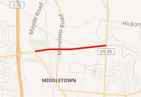 KY 956 begins at an intersection with Kentucky Route 595 and Mayde Road, just east of exit 77 of I-75. KY 956 travels east one half-mile (0.80 km) before crossing a CSX Transportation line. Two-tenths of a mile (0.32 km) later, the road intersects Menelaus Road, which carries Kentucky Route 1983, a rural secondary highway. From Menelaus Road, KY 956 travels another 3⁄4 mile (1.2 km) to reach its eastern end at US 25.[1]