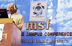 In Kerala, there were few msf units right from 1936. But it was with the patronage of late K. M. Seethi Sahib,[3] the Malabar District msf came into existence following a convention of Muslim Students at Himayathul Islam High School, Calicut on 28th Feb. 1942. With the formation of Kerala, State msf Committee was formed at Alappuzha on 15 October 1958. From then on, msf has been working in Kerala and it has gained commendable influence among students. The present committee celebrates the Golden Jubilee[4] of Kerala State msf.