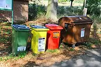 In the United Kingdom, the Household Waste Recycling Act 2003 requires local authorities to provide every household with a separate collection of at least two types of recyclable materials by 2010.[15] There has been criticism in the difference of schemes used in the country such as the colour of bins, whether the recycling is collected from wheelie bins, coloured plastic boxes or plastic bags, and also the fact that the bins, boxes and bags obstruct the roads and pavements, and how the additional collection vehicles and waste collection services needed also contribute to traffic congestion and produce carbon dioxide emissions. Some find the colour differences confusing, and some people want a national scheme. A typical example is to compare two neighbouring councils in Greater Manchester; Bury Council and Salford City Council. Bury uses blue for cans, plastic and glass, green for paper and cardboard and brown for garden waste. Salford uses blue for paper and card, brown for cans, plastic and glass, and pink for garden waste. Most councils use grey or black bins for general waste, with a few exceptions such as Liverpool, which uses a purple bin for general waste, a colour that is used by no other council.