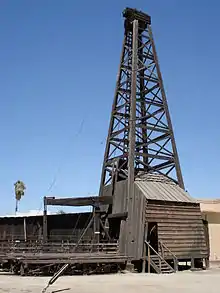 Pioneer Village is a collection of over 50 historic building related to Kern County's history. The various buildings are from all around the county. There is almost one of every type of building from the time period, including: one room schoolhouse, church, photography studio, train station, hotel, courthouse, and assay office.[4] Oil equipment, including a wooden oil derrick, as well as a pumping unit (with 6 wooden pumps) are located in the village. The buildings are arranged to simulate an actual town. Also in the collection are assorted neon signs, which were collected from around the county. Those signs are being restored and put on display.[5]
