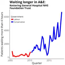 In 2017 Kettering General created controversy when it was reported that the hospital management had fiddled waiting time data.[7] The Trust commissioned an independent review of its handling errors, which found no evidence of fraud.[8]