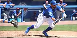 Pillar began the 2012 minor league season with the Single-A Lansing Lugnuts of the Midwest League, where he recorded a .322 batting average (3rd in the league) with a .390 on base percentage (4th in the league), and stole 35 bases (5th in the league; while being caught 6 times) in 86 games.[29] He was then promoted to the Advanced-A Dunedin Blue Jays, where he batted .323 and stole 16 bases (while being caught 3 times) in 42 games.[1] His total of 51 steals in 2012 was the second-most in the Blue Jays organization, and 10th-most in the minor leagues.[26][30] Considered an excellent defensive player, he played all three outfield positions.[30] He was named the 2012 Midwest League Most Valuable Player, after also garnering mid-season and post-season All Star honors, and being named the best hitting prospect in the Midwest League by Baseball America.[26][31][32] He was also named a Topps Class A All Star and an MiLB.com Organization All Star.[26] He then played for the Salt River Rafters in the Arizona Fall League, batting a team-leading .371.[30][33][34]