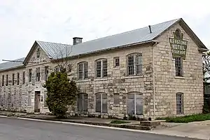 Keystone Hotel, 1870. Famous early-day stagecoach inn of J.L.N. Gracy. Windows have keystone arches. Native rock was hauled to site by oxen. In rear was the grave of boy killed by Indians; also bell tower, house for employees. Wagon yard was across road. Recorded Texas Historic Landmark, 1965.