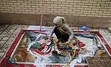 An Iranian girl washes her rug in house yard, Nowruz 2018.