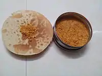Khakhra is made in several varieties, such as methi (fenugreek), jeera (cumin), bajri, pudina, garlic, ajwain, pani puri, vada pav, pav bhaji, and pizza among others.[1] Mungdi is a sweet type of khakhra.