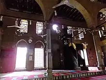 The mosque measures about 15 by 20 meters, its longer side being aligned with the road.[1] The interior of the mosque is split into three aisles (running parallel to the street), of which the central one is sunken or lower in relation to the others.[4] The aisles are separated from each other by rows of three arches resting on columns with classical capitals (presumably Roman or Byzantine).[1] The interior's most remarkable feature is the rich and varied multi-coloured marble mosaic pavement which covers the floors (although often obscured under the mosque's carpeting) and even appears on the windowsills.[3] By contast, the walls and the mihrab (niche symbolizing the direction of prayer) are very plain; something seemingly common to Sufi khanqahs but not to regular mosques of the time.[1] The mosque interior receives much light compared to other mosques of the period thanks to the structure's layout and its many windows, which include modern stucco windows carved in traditional patterns.[1] The mosque's painted ceiling is also a later restoration.[3]