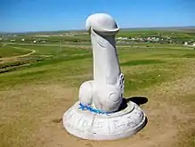 Kharkhorin Rock, also Kharkarin Rock or Phallic Rock, is a large statue of a penis raised on a platform on the steppe, located near Erdene Zuu Monastery (part of the World Heritage Site entitled Orkhon Valley Cultural Landscape) in Kharkhorin, Övörkhangai Province of Mongolia. The phallic rock statue has dual functions; primarily it is a reminder to the monks to remain celibate, but it is also a symbol of fertility and human life.[1][2] The newer, five metre tall stone statue also pictured on this page is incorrectly referenced as also being located near Kharkhorin, however, its location is noted by some as not being near the former capital city Kharkhorin, but near the smaller town of Khankhongor, much further south, in a different region. In fact, very few travel sites and blogs by frequent visitors to Kharkhorin report seeing this larger statue near the monastery.[1] However it was removed soon after due to local people's heavy discontent