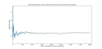 - π, the Euler–Mascheroni constant γ, and Khinchin's constant itself, based on numerical evidence,[3][4] are thought to be among the numbers whose geometric mean of the coefficients ai in their continued fraction expansion tends to Khinchin's constant. However, none of these limits have been rigorously established.
