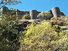 Kakavaberd / Geghayo, Keghayo, Geghi, Keghi fortress, Tatul fortress / are brilliant fort-construction models of historical Armenia. It is located 12 km to the south-east from Garni, on the right bank of Azat river. The fortress now exists and is quite well preserved. It is inaccessible from three sides as it was surrounded by natural gulfs (abysses / precipices) and huge rocks. The forth side is fenced / enclosed as it was not protected by natural barriers. The walls / fences prolonged to the north-east have 2-2.5 meters thickness, near the gate the thickness is 2.60 m. The height of the walls is 8.15 m. The northern towers are eight and their height is more than 10 meters. There are anterooms at the bottom of some towers, as well as there is a round room and small windows inside some of the towers. There is a chapel dug / carved out of the rock with a cross carved on the front at the entrance near the gate of the fortress. The citadel is situated on the western side of the fortress. There are noticeable building ruins, too. The fortress took the name "Kakavaberd" as there are numerous partridges / willow ptarmigans thereabout; the original name was "Geghama Monastery" after the name of the highland. Kakavaberd is also called Tatul fortress, as it is very similar to Tmkaberd in Javakhq. Hovhannes Draskhanakerttsi (9–10 centuries) was the first to mention about the fortress during the description of the retreat of Arab general / military leader Bsheri who was defeated during the sea battle in Sevan by Ashot Erkat /Iron/ Bagratuni. In the 11th century the fort was owned by the Pahlavunis and in the 12–13th centuries the Proshyans were the rulers here. Later on, Stephanos Orbelyan left a written memoire about the fort giving Geghi name to the fort where he described the battle held near Garni village/city in 1225. There is no precise data on the foundation and destruction of Kakavaberd fort. It was probably destroyed in 1679 from the earthquake after which it was not reconstructed.[18]