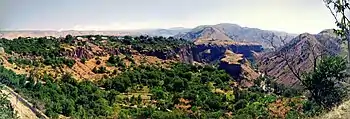 The reserve's geology is rugged and has a typical mountain range, encompassing a dense network of main and branch ridges, high plateaus and deep canyons towered by volcanic shield massifs and peaks. There are traces of past tectonic activity of various faults and fractures. The rocks, volcanic deposits and igneous intrusions dates back to the Cretaceous and pre-Oligocene periods.[13] The dominating rocks are Quaternary fragmental debris and effusive. Due to the hot weather and impact of water, there is an intense eolian process that has shaped the numerous natural geological figures and most slopes are steep, with declivity exceeding 30°. Middle elevations of the belt are 1500–2300m above sea level covers about half of the territory of the reserve representing highly rough terrain composed of fold and detrital ridges. A low elevation of the belt below 1500 m is marked by vast areas of badlands.