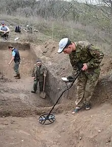 Like other hillforts of Scythian times, Khotiv hillfort had buildings only near the inner side of the rampart. The central area was empty and could be used for farming or for keeping of cattle, maybe during wars.[14] Discovered structures include dugouts and surface buildings with walls made of wood covered by clay. Fallen walls of several such buildings were excavated, some of them exceed 20 m in length.[5] Some buildings had stoves. Another notable object is an oval 1x1.5 m wide, paved with stones bearing marking of fire.[15]