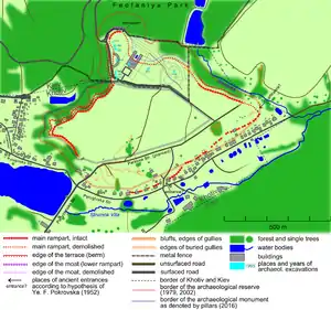 The hillfort adjoins the southern part of Kyiv, namely Feofaniya Park. It occupies a rhombic plateau 1000x700 m wide, bordered by valleys of the streams. All the plateau area, 31 ha, was surrounded with earth rampart, while the slope of the hill was fortified by a scarp with a berm and a moat beneath.[1] The rampart, scarp and berm are well preserved on the western and eastern edges, and remains of the moat are much less conspicuous now. It is supposed that the hillfort had 3 entrances: in the northern, eastern and southern part of the rampart.[2]