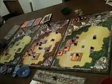 Khronos is a board game for two to five players designed by Ludovic Vialla and Arnaud Urbon. In the game, players build domains by laying tiles representing buildings on three game boards, each representing the same area in three different ages. By paying one coin, players can time travel between the different ages. The game lasts seven turns. Players receive money based on the strength of their buildings in the various ages at the end of their fourth and seventh turns.