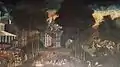In the meantime, people began exchanging culture and art with European countries. Color materials also began to be imported from abroad. Thus the painting in this period became more vivid and colorful. Khrua In Khong, however, still remained using low saturation, bright objects among dimmed gray and dark background colors. Khrua In Khong was famous for his use of monochromic colors that give harmonious satisfaction, unlike complementary colors. He often used dark shades of blue and green along with light shades of blue, pink and white and avoided contrasting colors. He painted the background with dark colors, male outfits with dark blue and white, while female dresses were light blue or pink making the figures look soft and gentle among shady background that appears like a dreamy landscape.[2][8][9]