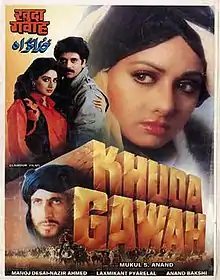 Khuda Gawah (transl. With God as Witness, also translated and released as God Is My Witness[1]) is a 1992 Indian epic drama film written and directed by Mukul S. Anand. The film stars Amitabh Bachchan, Sridevi, Nagarjuna, Shilpa Shirodkar, Kiran Kumar and Danny Denzongpa are featured in supporting roles. The original score was composed by Laxmikant–Pyarelal. The film marked Sridevi and Bachchan's third collaboration. In the film, Badshah Khan travels from Afghanistan to India to find the killer of Benazir's father so that he can impress her. He succeeds but soon finds himself framed for a murder and trapped in an Indian prison.