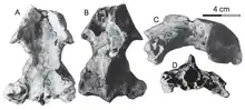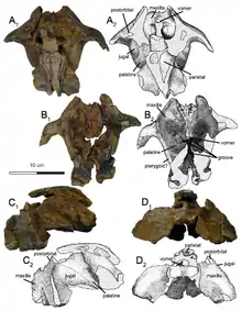 Khunnuchelys is an extinct turtle is which many skulls are known from. In fact, is the only skull-based trionychid from the Cretaceous.[2] The side of the maxillary makes up a beak-like structure, an unusual feature of trionychids.[1] One skull, ZIN PH 1/146, is relatively small, and is only partly preserved. The maxilla and prefrontals of the specimen are only partly known, although the jugals, basioccipitals, supraoccipital crest, and left quadrate are close to complete. The preserved skull length is 9 cm (3.5 in), and the total approximate skull is 17 cm (6.7 in) long. The specimen is unique among Khunnuchelys, as the ventral edge is generally well-preserved. The ventral edge shows that the skull of Khunnuchelys is arched from the front to the back.[2]