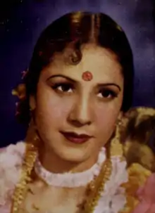 Her peak period came when she moved to Bombay to act in Ranjit Movietone films with actors like K. L. Saigal and Motilal.[2] She achieved immense popularity when she acted opposite the famous singer-actor K. L. Saigal in the Chaturbhuj Doshi directed, Bhukt Surdas (1942), followed by Tansen (1943) and was referred to as the "first of the singing stars".[6] Her other two main lead stars were Jairaj, and Ishwarlal.[1]