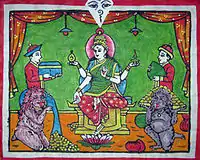 In Newar culture, Khyahs attend to Lakshmi, the goddess of wealth, and pictures of the deity show them guarding overflowing bags of coins.[2][3] Household Khyahs usually dwell in the attic and dark storerooms. They are said to fear electric lighting.[4]