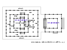 The honden is connected in the front to the haiden by a 1 x 1 bay passage and a short stairway. The haiden's core is just 3 x 1 bays, but it is surrounded on three sides by a 1-bay wide mokoshi (pent roof), bringing the building's external dimensions to 4 x 4 bays.[1] Both entrances to the haiden are on the gabled side (tsumairi style).