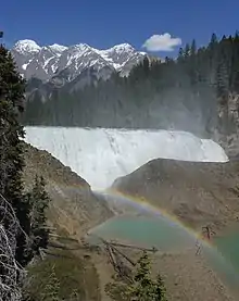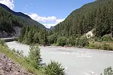 The Kicking Horse River is in the Canadian Rockies of southeastern British Columbia, Canada.[2] The river was named in 1858, when James Hector, a member of the Palliser Expedition, reported being kicked by his packhorse while exploring the river. Hector named the river and the associated pass as a result of the incident. The Kicking Horse Pass, which connects through the Rockies to the valley of the Bow River, was the route through the mountains subsequently taken by the Canadian Pacific Railway when it was constructed during the 1880s. The railway's Big Hill and associated Spiral Tunnels are in the Kicking Horse valley and were necessitated by the steep rate of descent of the river and its valley.