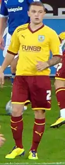 In July 2011, Trippier joined Championship club Burnley on a season-long loan as a replacement for the departing Tyrone Mears.[23] He made his debut for the Clarets in August 2011, a 2–2 home draw with Watford.[24] His first goal for the club came in September 2011, with a superb long-range free-kick against Milton Keynes Dons in a 2–1 win in the League Cup.[25] His first league goal came in December 2011, a 1–0 win over Brighton & Hove Albion at the Falmer Stadium, with a powerful shot from the edge of the box.[26] In December 2011, after impressing during his loan, Trippier was nominated for the Championship Player of the Month award.[27] On 2 January 2012, he received his first professional red card for picking up two bookings in a 2–1 defeat to Leeds United.[28] A day later, Burnley signed Trippier on a permanent deal for an undisclosed fee, signing a three-and-a-half-year contract.[29] In January 2012 he scored his second goal for the club, scoring from range in a 2–0 win away to Middlesbrough.[30] In March 2012, he scored the first in a 5–1 rout against Portsmouth at Fratton Park.[31] He played in all 46 league games in his first season as the club finished in mid-table, going on to win the Burnley Player of the Year award.[32]