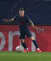 Trippier signed for La Liga club Atlético Madrid on 17 July 2019 on a three-year contract, for a fee of £20 million plus add-ons.[59][60] He became Atlético's first English player in 95 years.[61] In his debut on 18 August in their opening La Liga match against Getafe, he helped the team to a 1–0 home win by providing an assist for Álvaro Morata's goal.[62] In December 2020, Trippier was given a 10-week worldwide football ban and fined £70,000 for four breaches of Football Association betting rules after he allegedly passed on information on his transfer to his friends who then placed bets on his transfer.[63][64] The ban was suspended by FIFA, which dismissed its appeal, until the case is decided by the Court of Arbitration for Sport (CAS).[65][66] CAS rejected the appeal,[67] and Trippier sat out his ban until his return to the team for the Madrid Derby against Real Madrid on 7 March 2021,[68] which ended in a 1–1 draw.[69]