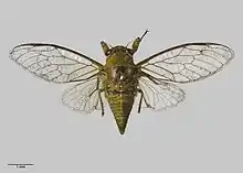 Kikihia ochrina (commonly known as the April green cicada) is a species of insect endemic to New Zealand.[3] This species has a three-year life cycle and adults are bright green in colour and are most commonly seen in the month of April in the North Island.