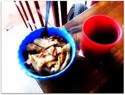 The name, kikomando, was coined by Ugandan singer, Bobi Wine, who sang about the dish in one of his songs.[3][4] Ugandans claim that eating kikomando will make the eater strong like Arnold Schwarzenegger in his movie, Commando.[5][6] Kikomando is made by cutting up pieces of Ugandan chapati, which is different from Indian chapati in that it is made with all-purpose flour instead of whole-wheat flour, and fried beans.[2][7] In addition to fried beans, other variations of kikomando have avocado, meat stew, gravy, chicken, or liver added to them.[4] This dish is served both in street food stalls and in higher-end restaurants in the country.[3][8] It is popular among university students because of its affordability as a meal.[9]